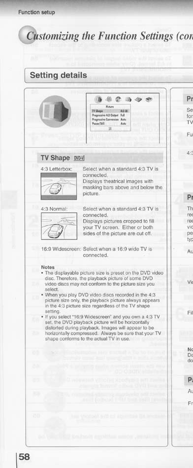 We thumbed through the DVD player's user guide. On page 58 (!), under "Customizing the Function Settings" (see second example), we found the option we were looking for: TV Shape.